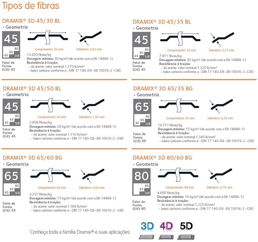 Produzidas pela Belgo Arames, as fibras de aço Dramix® são comercializadas em diversos comprimentos e diâmetros, em pentes com as fibras coladas entre si ou em fibras soltas, dependendo da aplicação.